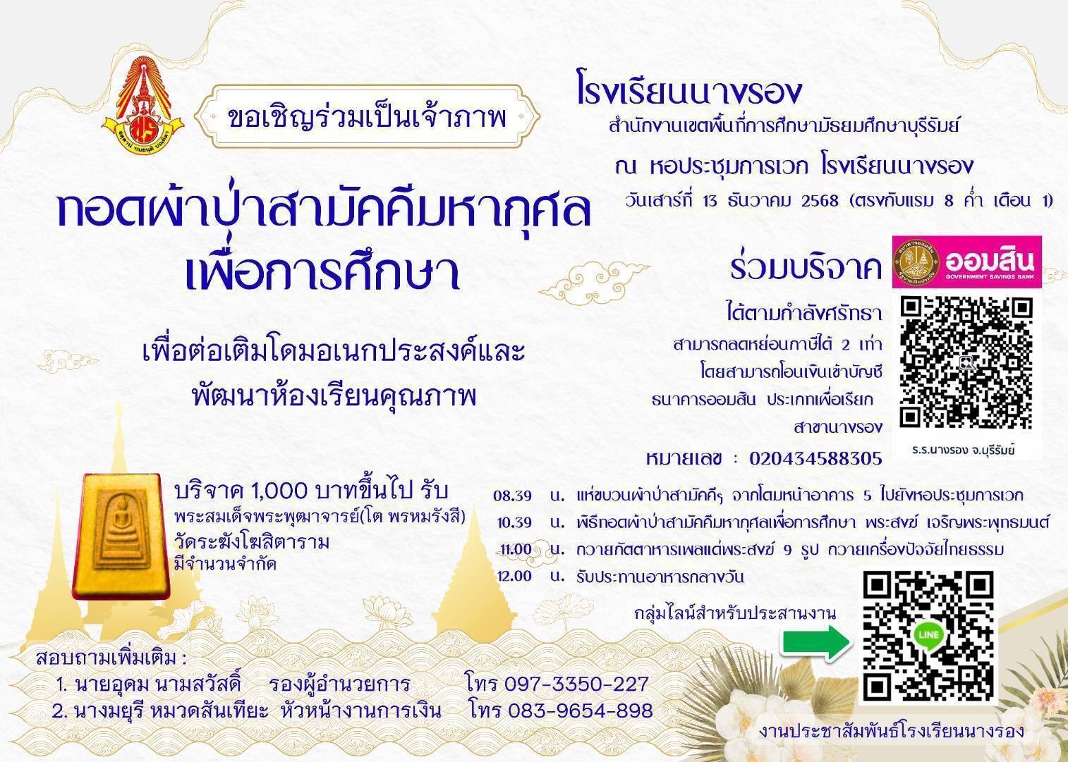 เชิญชวนทุกท่านบริจาคเพิ่มเติมได้ที่บัญชีธนาคารออมสิน 020434588305 โรงเรียนนางรอง หรือสแกนคิวอาร์โค้ด (ลดหย่อนภาษีได้ 2 เท่า)