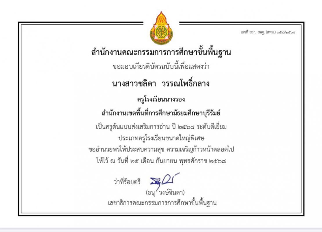ไม่มีหมวดหมู่ ครูต้นแบบส่งเสริมการอ่าน ปี ๒๕๖๘ Posted on 10 ตุลาคม 202513 ตุลาคม 2025 by อัคร ศรีเมือง 10 ต.ค. นางสาวชลิดา วรรณโพธิ์กลาง 🌻 ได้รับคัดเลือกเป็น ครูต้นแบบส่งเสริมการอ่าน ปี ๒๕๖๘ 📖📗✨ระดับดีเยี่ยม ✨ ประเภทโรงเรียนขนาดใหญ่พิเศษ จาก สพฐ. กระทรวงศึกษาธิการ อัคร ศรีเมือง ประกาศวันเปิด-ปิดภาคเรียน ผู้มีวิธีปฏิบัติที่เป็นเลิศ (BEST PRACTICE) ระดับ ดีเยี่ยม