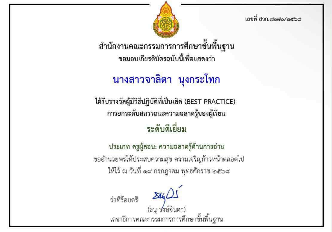 รางวัลนี้เป็นเครื่องยืนยันถึงความทุ่มเท ความสามารถ และวิธีการจัดการเรียนรู้ที่เป็นเลิศของคุณครูจาลิตา ในการพัฒนาและส่งเสริมสมรรถนะด้านความฉลาดรู้ด้านการอ่านของนักเรียนอย่างแท้จริง