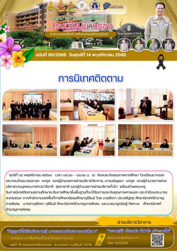 ข่าวสารในโรงเรียน การนิเทศติดตามสถานศึกษาระดับการศึกษาขั้นพื้นฐาน ที่จะได้รับการประกันคุณภาพภายนอก ประจำปีงบประมาณ พ.ศ.๒๕๖๙ Posted on พฤศจิกายน 14, 2025พฤศจิกายน 25, 2025 by admin 14 พ.ย. วันที่ ๑๔ พฤศจิกายน ๒๕๖๘ เวลา ๐๙.๐๐ – ๑๐.๓๐ น. ณ […] Continue reading →