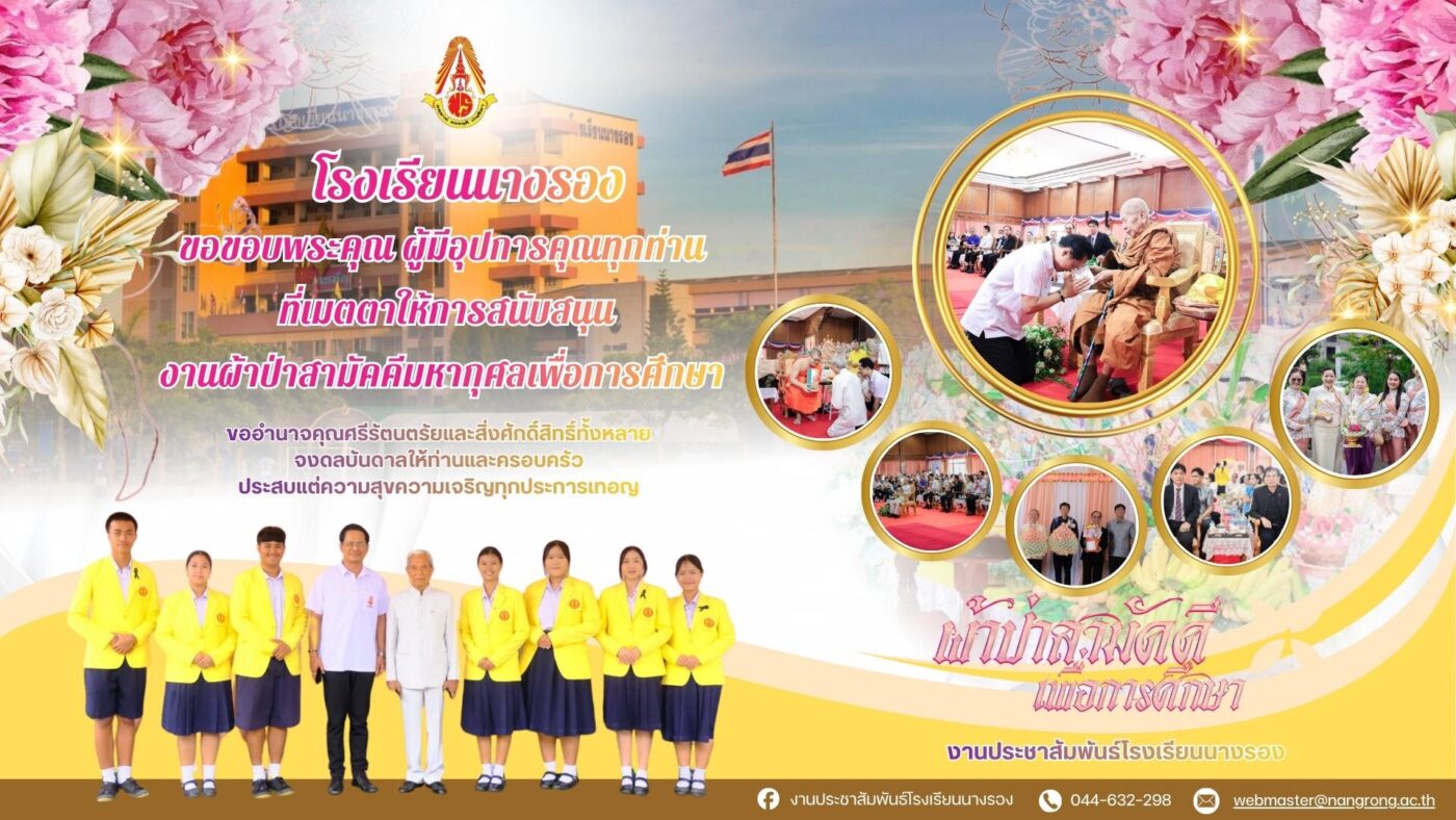 “ในนามของคณะผู้บริหาร ครู บุคลากร และนักเรียนโรงเรียนนางรอง ขอกราบขอบพระคุณในความเมตตาและกุศลเจตนาของท่านที่ได้ร่วมบริจาคปัจจัยสมทบทุนผ้าป่าเพื่อการศึกษา ความร่วมมือร่วมใจของท่านในครั้งนี้คือพลังสำคัญในการขับเคลื่อนคุณภาพการศึกษาของเยาวชน ขออำนาจคุณพระศรีรัตนตรัยและสิ่งศักดิ์สิทธิ์ทั้งหลาย โปรดดลบันดาลให้ท่านและครอบครัวประสบแต่ความสุขสิริสวัสดิ์ พิพัฒนมงคล สมบูรณ์พูนผลในสิ่งอันพึงปรารถนาทุกประการ”