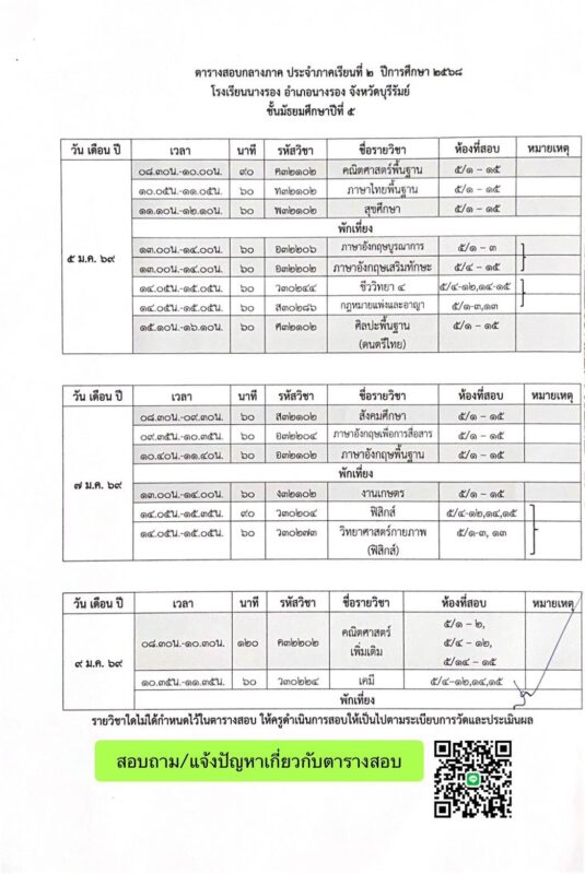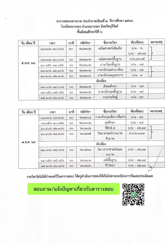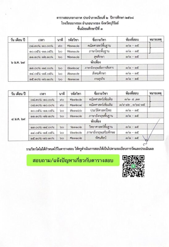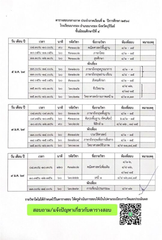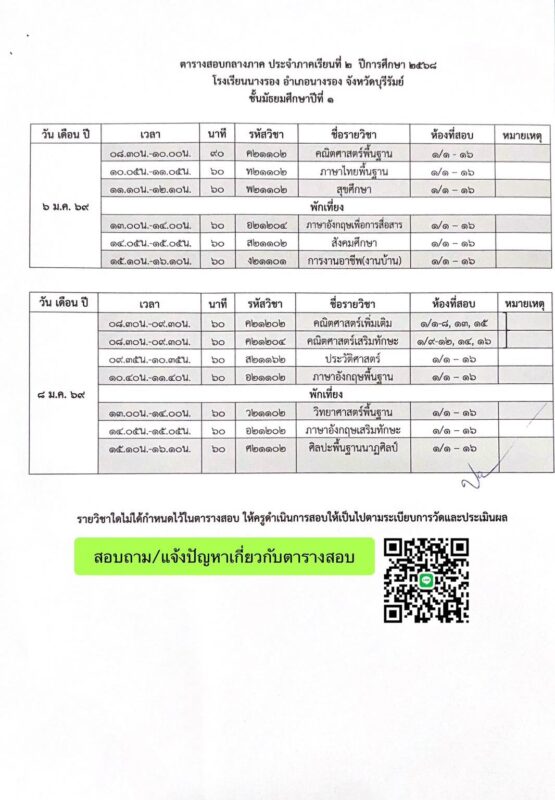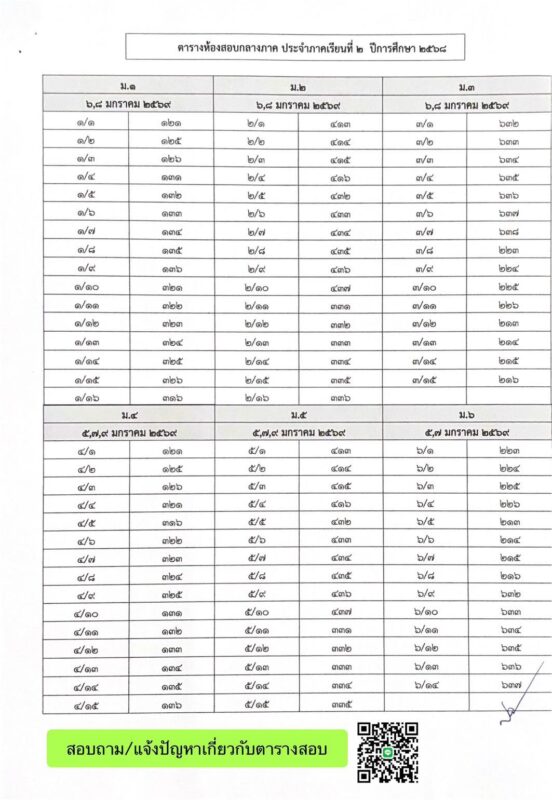 ตารางสอบกลางภาค ภาคเรียนที่ 2 ปีการศึกษา 2568 ของนักเรียนระดับชั้นมัธยมศึกษาปีที่ 1-6 สอบวันที่ 5-9 มกราคม พ.ศ.2569