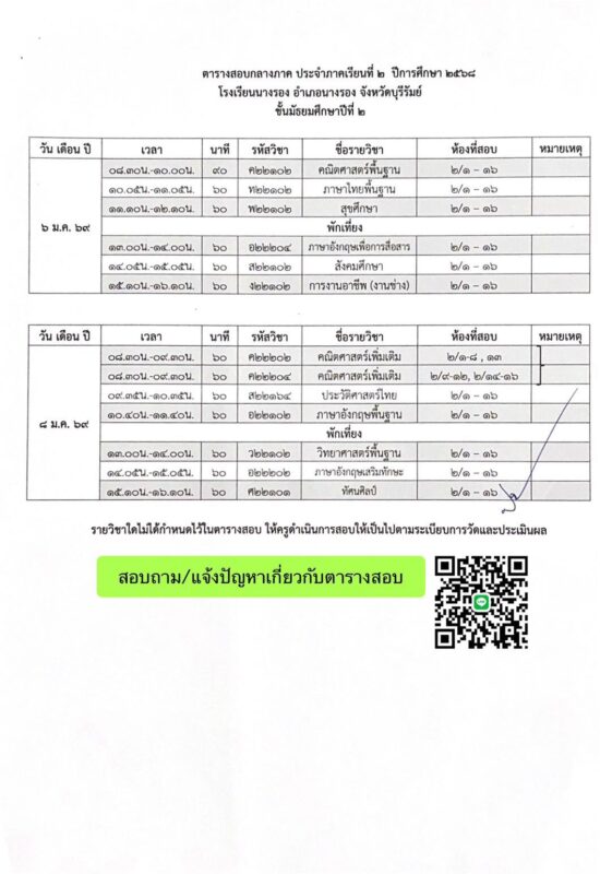 ตารางสอบกลางภาค ภาคเรียนที่ 2 ปีการศึกษา 2568