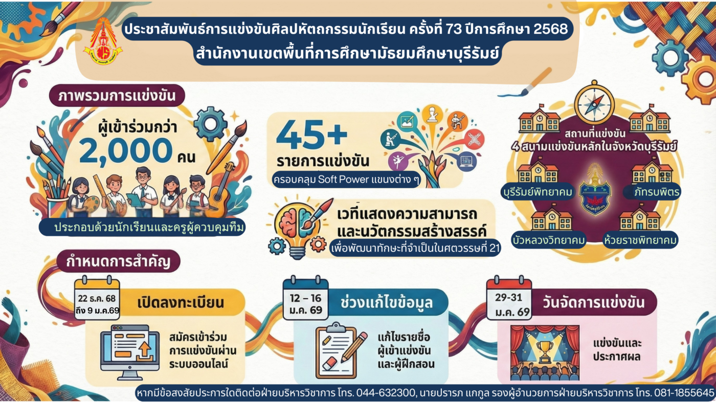 ข่าวสารในโรงเรียน ประชาสัมพันธ์การแข่งขันศิลปหัตกรรมนักเรียนครั้งที่ 73 สำนักงานเขตพื้นที่การศึกษามัธยมศึกษาบุรีรัมย์ Posted on ธันวาคม 24, 2025 by admin 24 ธ.ค. “ก้าวสู่เวทีแห่งศักยภาพและจินตนาการ ในงานศิลปหัตถ […] Continue reading →