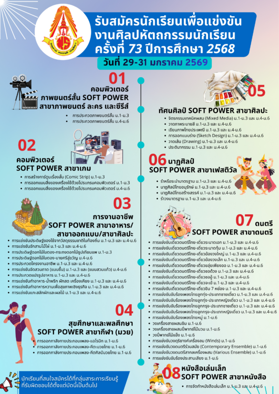 ขอเชิญร่วมส่งเสริมและเป็นกำลังใจให้แก่เยาวชนไทยในงานศิลปหัตถกรรมนักเรียน ครั้งที่ 73 เวทีที่เปิดโอกาสให้นักเรียนได้แสดงออกถึงทักษะความเป็นเลิศทางวิชาการ ศิลปะ ดนตรี หัตถกรรม และนวัตกรรมสร้างสรรค์ พร้อมแลกเปลี่ยนเรียนรู้เพื่อพัฒนาทักษะในศตวรรษที่ 21 โดยมีคณะครูและนักเรียนเข้าร่วมกว่า 2,000 คน ในการแข่งขันกว่า 45 รายการ