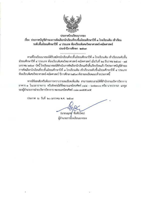 ข่าวสารในโรงเรียน ประกาศบัญชีสำรองการคัดเลือกนักเรียนที่จบชั้นมัธยมศึกษาปีที่ 3 โรงเรียนเดิม เข้าเรียนระดับชั้นมัธยมศึกษาปีที่ 4 ห้องเรียนพิเศษวิทยาศาสตร์-คณิตศาสตร์ ปีการศึกษา 2569 Posted on มกราคม 20, 2026มกราคม 23, 2026 by admin 20 ม.ค. admin ประกาศผลการคัดเลือกนักเรียนที่จบชั้นมัธยมศึกษาปีที่ 3 โรงเรียนเดิม เข้าเรียนระดับชั้นมัธยมศึกษาปีที่ 4 ห้องเรียนพิเศษวิทยาศาสตร์-คณิตศาสตร์ ปีการศึกษา 2569 ประกาศผลการคัดเลือกนักเรียนที่จบชั้นมัธยมศึกษาปีที่ 3 โรงเรียนเดิม เข้าเรียนระดับชั้นมัธยมศึกษาปีที่ 4 ห้องเรียนวิทยาศาสตร์พลังสิบ ปีการศึกษา 2569