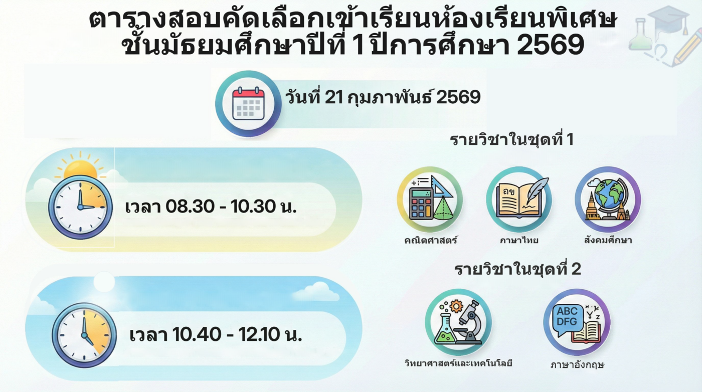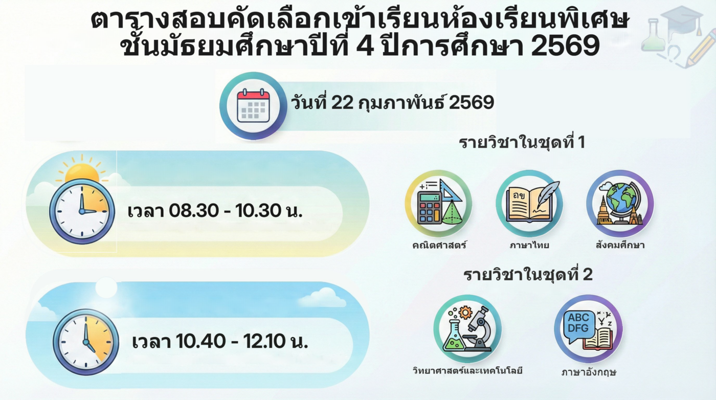 โรงเรียนนางรองขอแจ้งให้นักเรียนและผู้ปกครองทราบว่า ขณะนี้ได้ดำเนินการประกาศรายชื่อผู้มีสิทธิ์สอบคัดเลือกเข้าศึกษาต่อ ในระดับชั้นมัธยมศึกษาปีที่ ๑ และชั้นมัธยมศึกษาปีที่ ๔ ประเภทห้องเรียนพิเศษวิทยาศาสตร์ คณิตศาสตร์ (Gifted) และห้องเรียนพิเศษภาษาอังกฤษ (IEP) เรียบร้อยแล้ว กำหนดการสอบคัดเลือก:ระดับชั้น ม.๑: วันเสาร์ที่ ๒๑ กุมภาพันธ์ ๒๕๖๙ ระดับชั้น ม.๔: วันอาทิตย์ที่ ๒๒ กุมภาพันธ์ ๒๕๖๙ ตรวจสอบรายชื่อผู้มีสิทธิ์สอบได้ที่